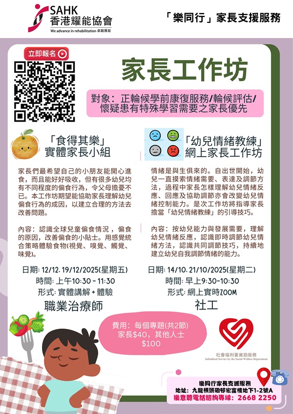 為現正輪候學前康復服務、評估或懷疑有發展障礙之學前幼兒家長提供專業支援服務,貫徹及早識別與介入之理念。